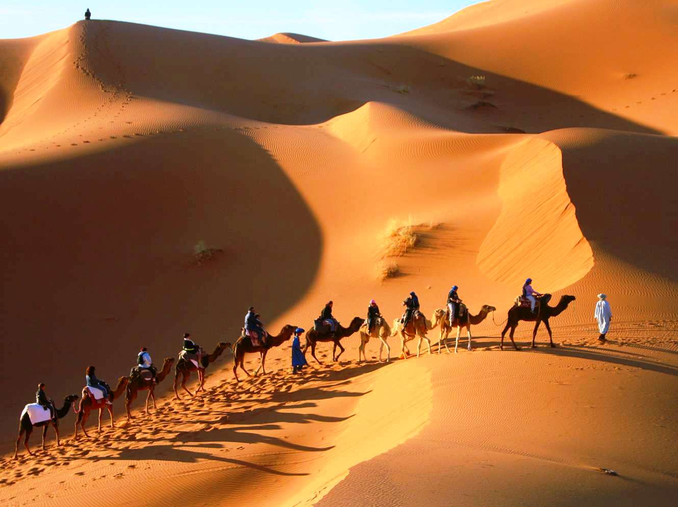 Today you discover the majesty of Erg Chigaga desert with its endless sand dunes and breath-taking scenery. After a 2-hour drive through dirty tracks in 4x4 Jeep, we join the most spectacular vast desert of Erg Chigaga dunes. You will drive via the beaten tracks through less undiscovered places where you can experience a sense of wilderness, breathe clean air of the Sahara desert and explore the diversity of wonderfully changing landscapes with splendid undulating sand dunes. You have a camel ride experience for the sunset. In the evening we make fire and admire a purely sky full with brightly stars and night out in the open air with moments of real pleasure to discover constellations.