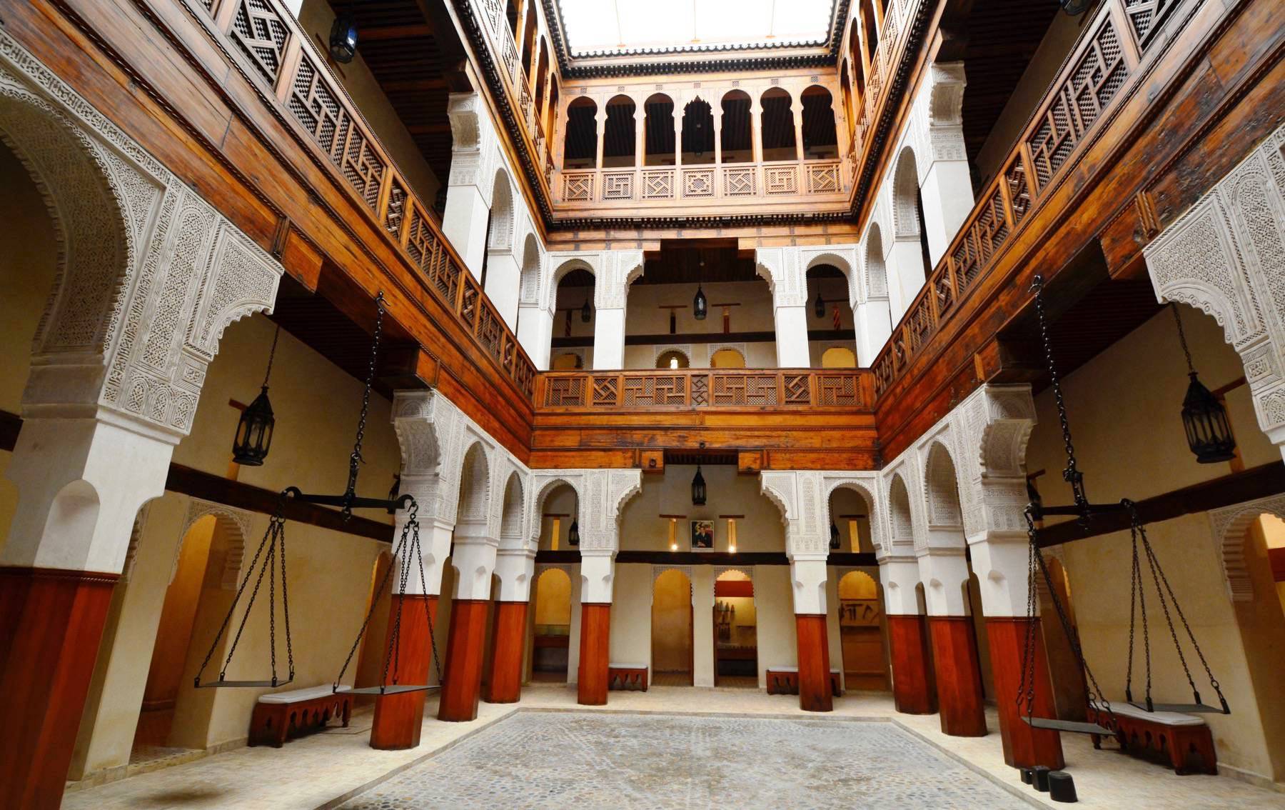 After breakfast, you will meet your private tour guide to enjoy a guided city tour to explore the first imperial city of Morocco, Fes; this UNESCO World Heritage Site was founded in the 9th century, and is home to the world's oldest university. The first stop of the morning is a visit to the entrance of the largest royal palace in Morocco. Afterwards, we will drive for a wonderful panoramic views of the whole medina from the southern tower of Fes, visit a pottery co-operative where tiles and Moroccan mosaic are made. We will visit the tanneries, to watch the locals working with the skins of animals such as goat, camel and cow. We will explore a Medrassa (Koranic school), the Nejjarine fountain, the Moulay Idriss mausoleum, and the Karaouine Mosque University. Enjoy a Moroccan lunch at a traditional restaurant in the Medina. Afterwards, continue to explore the medina and its narrow alleys house hundreds of merchants and craftsmen selling a range of products such as dates, fish, spices, copper urns and musical instruments. The rest of the day is at leisure with overnight at the Riad or hotel.