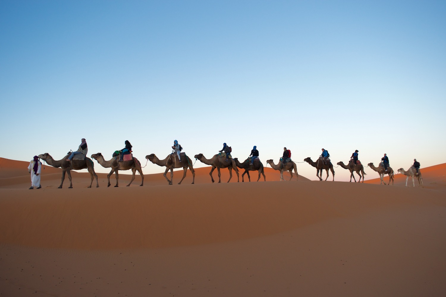 Start your desert tour from Erfoud with an optional stop to visit Fossils workshop. You can choose to visit the mausoleum of Moulay Ali Chrief, the founder of the Alaouite dynasty. You will arrive to a typical village to experience the local music as you listen to the rhythms of a Gnaoua band. You can try a sample of a delicious desert Pie or a Berber Pizza. Arrive to Merzouga where you will have some time to relax before you start the desert adventure on the back of camels. You will ride over the sands as the sun begins to set and as you reach the magnificent Erg Chebbi sand dunes, witness them turning a wonderful red hue. As night falls, listen to the intoxicating beat of Berber drum music and enjoy a Moroccan home-cooked feast before sleeping in a private tent with private bathrooms and hot showers.