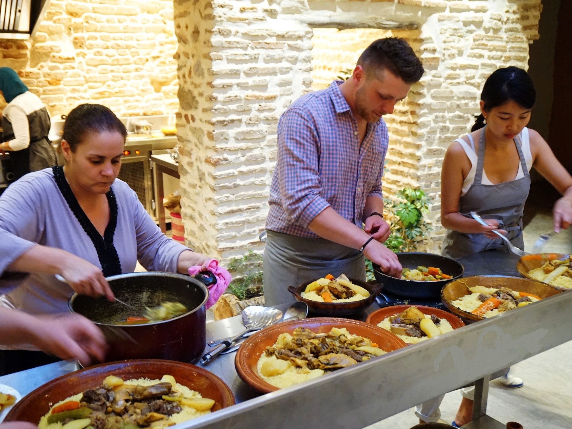 The cooking class takes place at an eco-friendly farm centered in an authentic Berber kitchen stocked with traditional items for food preparation.