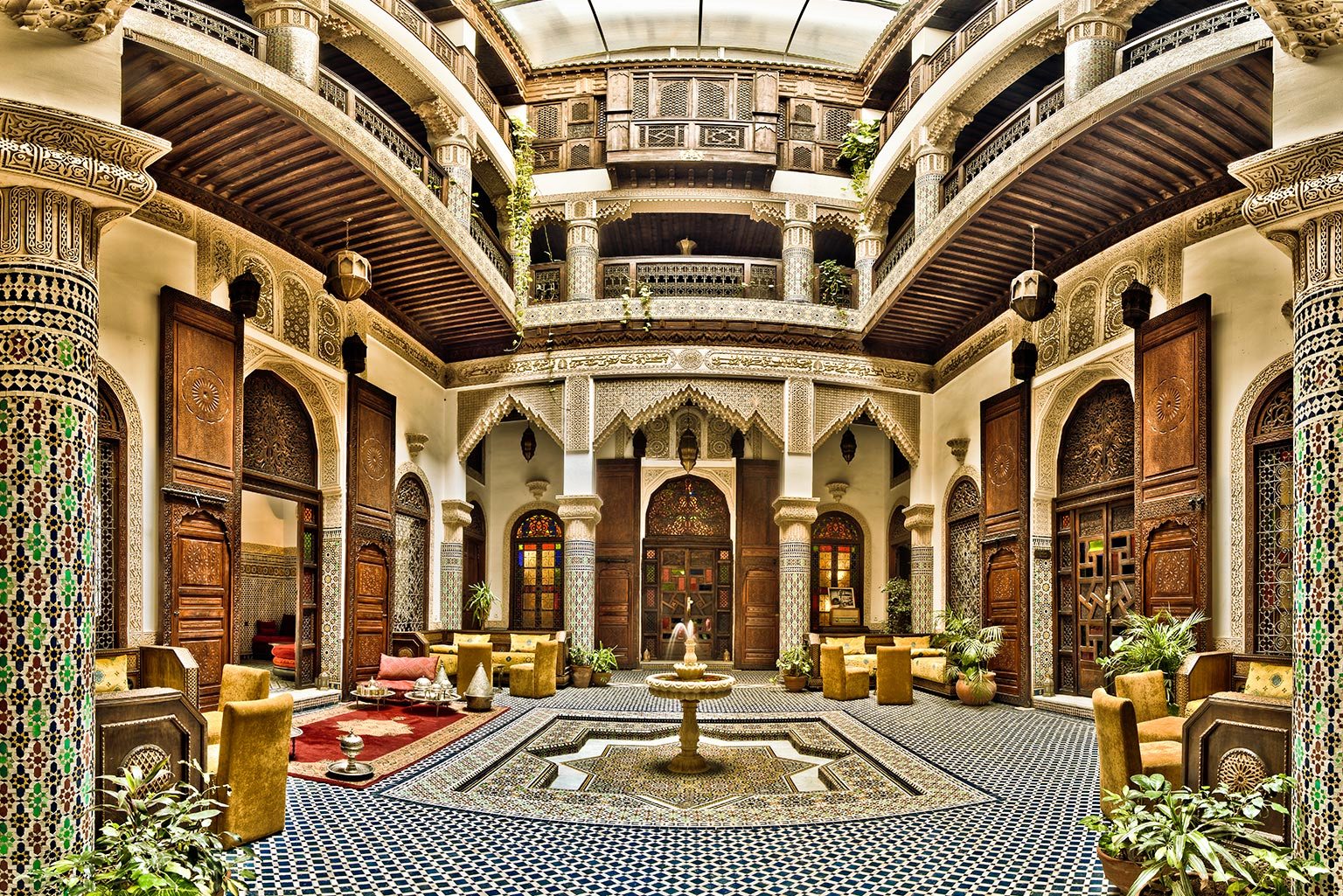 Today you will meet your local tour guide to explore the old medieval medina of Fez and the first imperial city, a real labyrinthine of more than 9000 alleyways and deserves to be the intellectual and cultural capital of the kingdom. You will start with a stop by the ornamented Royal Palace gate. Then, you will enjoy a panoramic view of the southern tower of Fes, and visit the cooperative of pottery where they make tiles and Moroccan mosaic. You will mingle with local people in the narrow streets full of articles, colors and donkeys carrying goods. You will see a lot of handcrafted items. We will explore one of the Koranic school (Medrassa), the Nejjarine fountain, and the Karaouine Mosque University. The leather tanneries, famous in Fes, is one the highlights of the tour, watching locals working on skins of goat, lamb, camel and cow, in small pits. You also will indulge yourselves with some special dishes of Fes cuisine. The rest of the day is at leisure with overnight at the luxury hotel with breakfast.